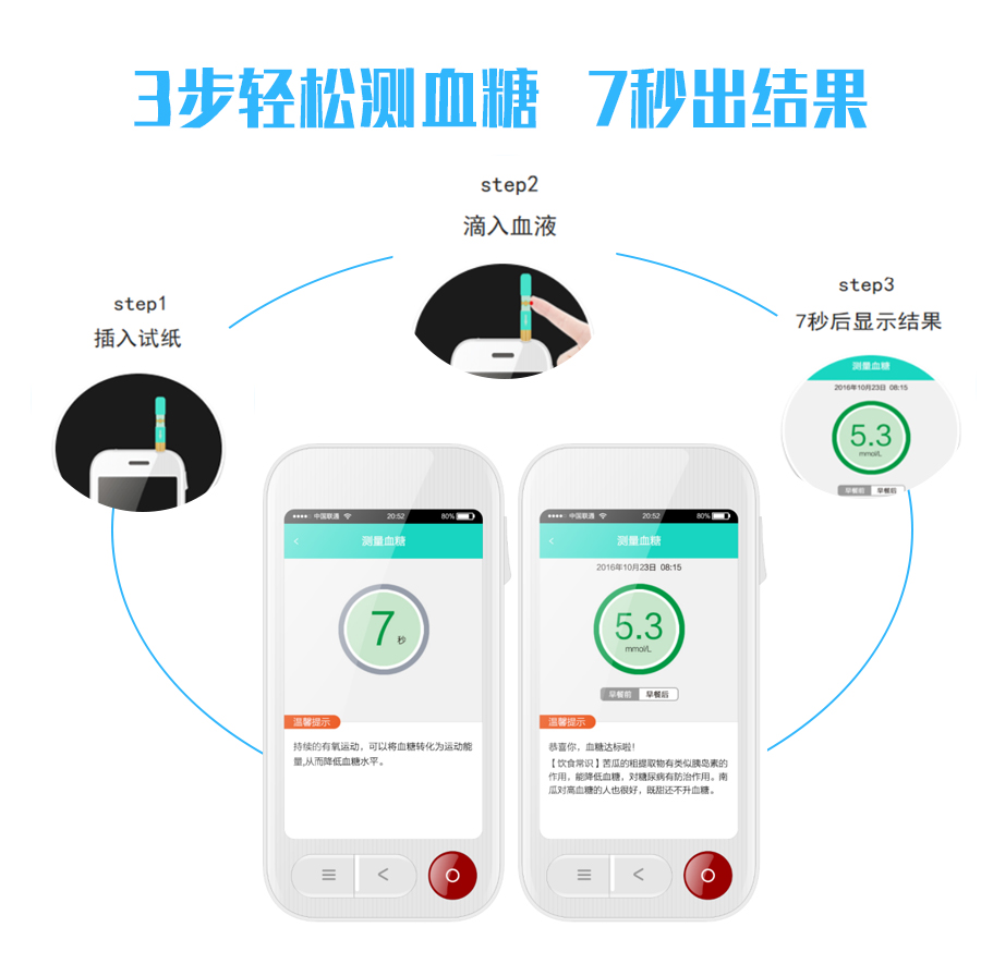 4、手機(jī)血糖儀操作(zuò)簡便,界面友好,結果直觀,測(ce)完血糖實時給出解決方(fang)案
